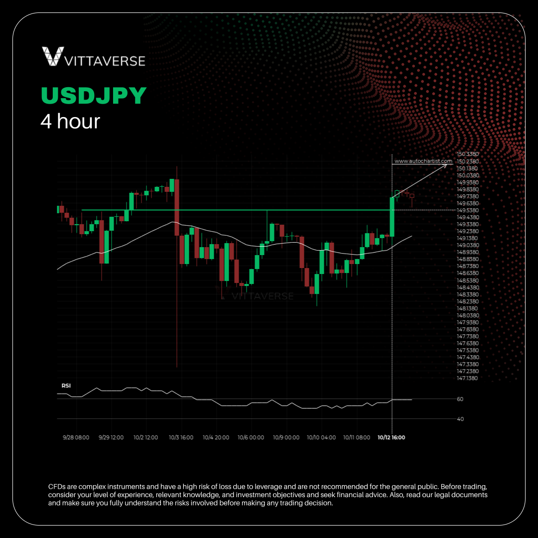 USDJPY has broken through a resistance line. It has touched this line numerous times in the last 15 days. This breakout shows a potential move to 150.1928 within the next 2 days. Because we have seen it retrace from this level in the past, one should wait for confirmation of the breakout.